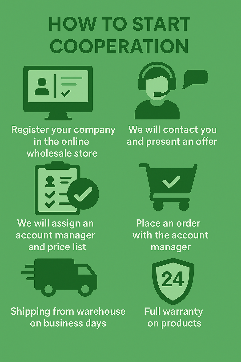 To start working with us, you need to register your company in our online wholesale platform. The registration process is simple and takes about 2 minutes. Registering does not commit you to anything. We do not sell data or send spam.