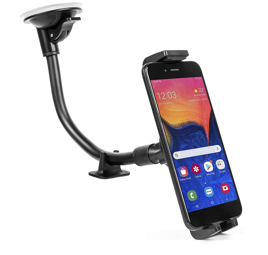 The extremely long holder arm, up to 300 mm, is made of very elastic material, which allows it to be given any shape and thus adjusts the position of the phone to its own needs. This material also absorbs the vibration generated during the ride.