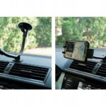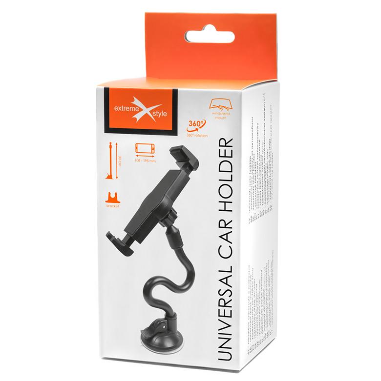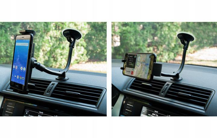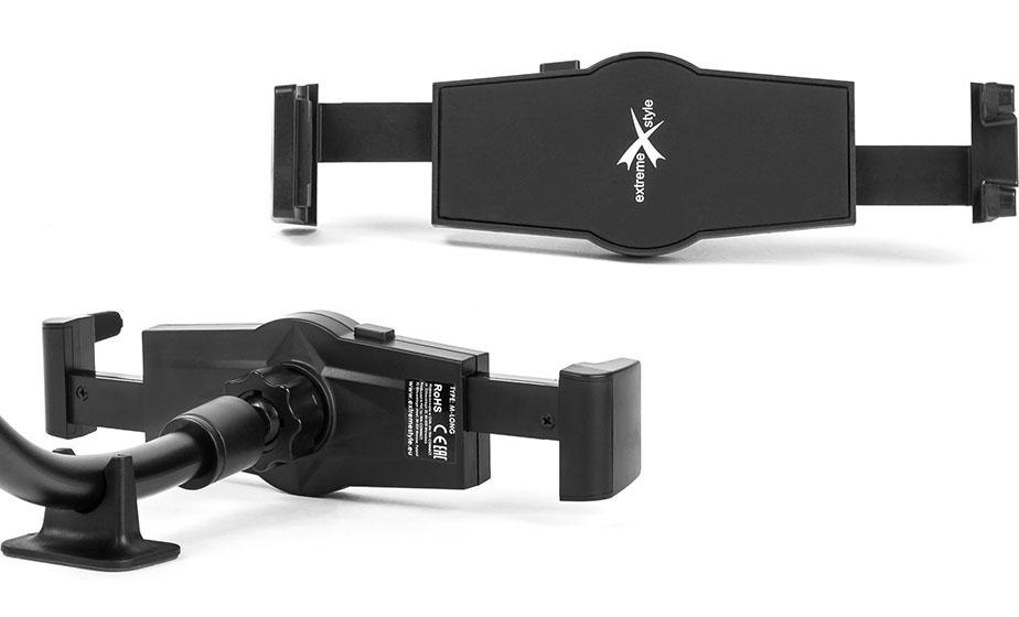 Universal car holder for mobile devices. High quality materials and extremely careful execution make the holder extremely durable. The holder head is equipped with two spring-loaded arms, so you can insert or remove phone with one hand.