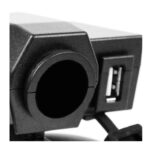 Motorcycle cigarette lighter socket with additional USB output mounted to the steering wheel. Universal output make the socket is compatible with virtually any device available on the market, eg. navigation, mobile phones and others.