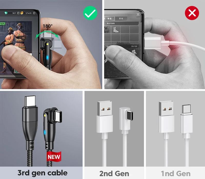 The 180º bent end of the cable allows you to position it so that it does not interfere while watching a movie or playing games.