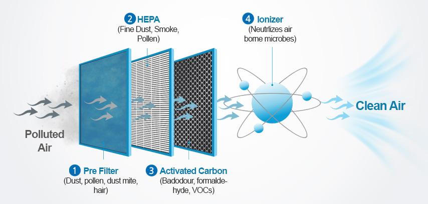 Dodatkowy wkład z węglem aktywnym absorbuje zapachy oraz lotne związki organiczne (VOCs) m.in. toluen, ksylen i formaldehyd, silnie trujący gaz m.in. będący składnikiem dymu papierosowego.
