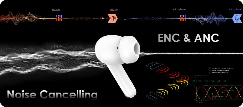 Słuchawki wyposażono w systemy redukcji szumów otoczenia, ENC – blokujący otaczające dźwięki i odbierający tylko Twój głos podczas korzystania z nich do rozmów telefonicznych, dzięki czemu druga osoba może łatwo Cię usłyszeć, oraz ANC czyli aktywne redukowanie niepożądanych dźwięków dochodzących z zewnątrz, które są irytujące i męczące dla użytkownika sprzętu (funkcja działa zarówno przy odtwarzaniu muzyki jak i bez).