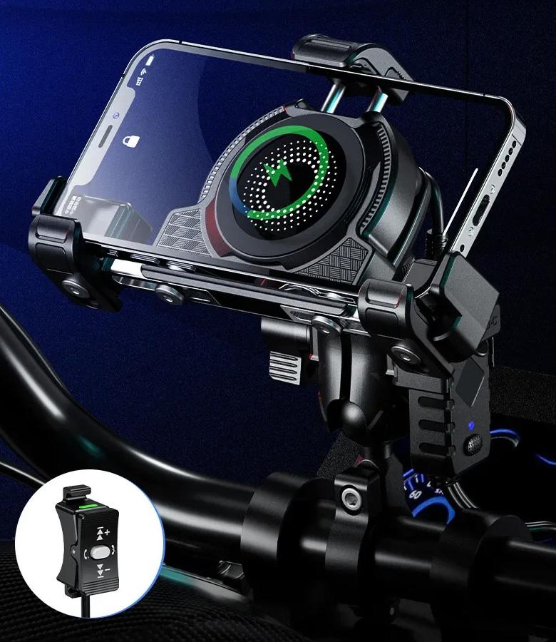To przede wszystkim wygoda i bezpieczeństwo! Poza tym, to połączenie ładowarki bezprzewodowej – indukcyjnej z uchwytem motocyklowym do telefonu.