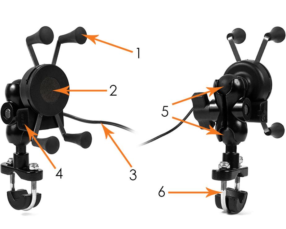 Uchwyt posiada uniwersalną ładowarkę USB o natężeniu 2.1 A. Wyjście USB zostało zabezpieczone gumową zaślepką chroniącą przed dostawaniem się kurzu i wody podczas gdy nie jest używane oraz dodatkowo wyposażone w mały, biały wyłącznik umożliwiający odcięcie zasilania gdy uchwyt nie jest używany.