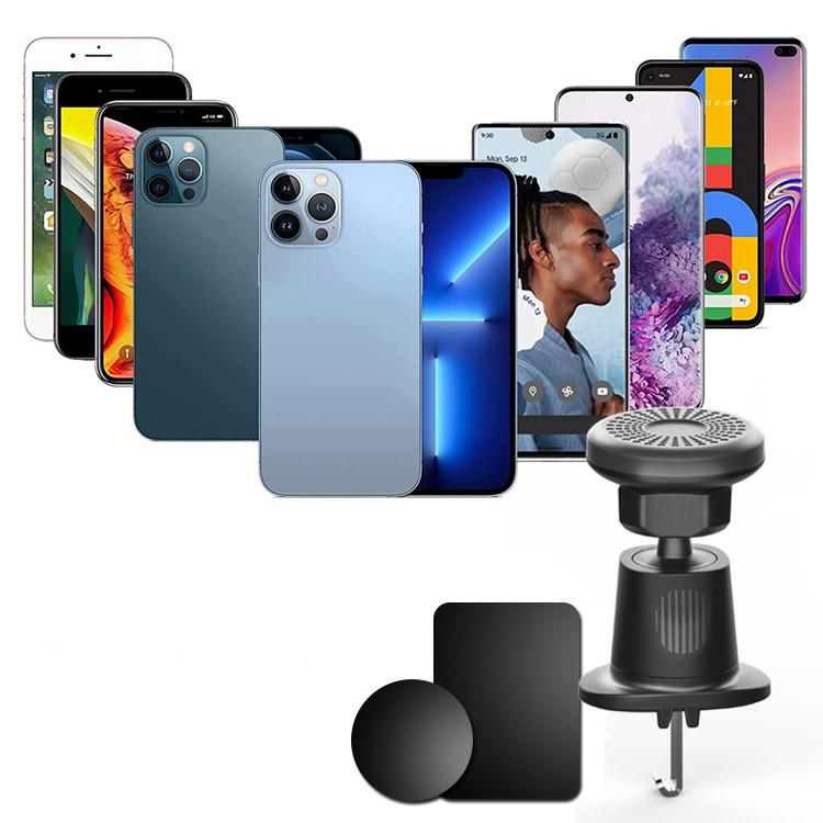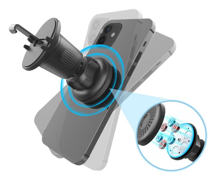 Silne magnesy i obrotowa o 360 stopni głowica umożliwiają na optymalne ustawienie telefonu zarówno w pionie jak i w poziomie.