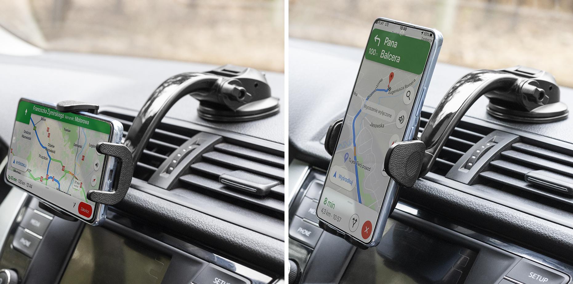 To samo połączenie pozwala na regulację pochylenia telefonu względem szyby czy deski w samochodzie.